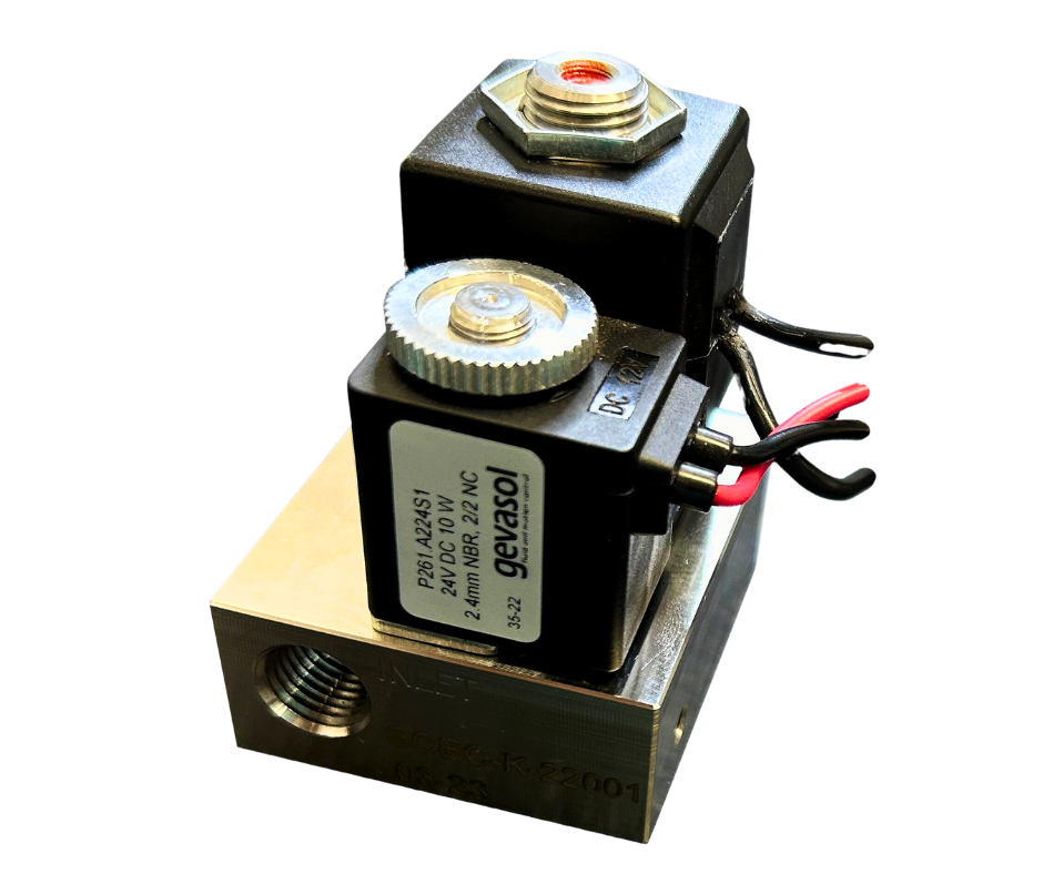 A small manifold combining the proportional valve with a normally open shut-off valve changes the function from NC to NO.